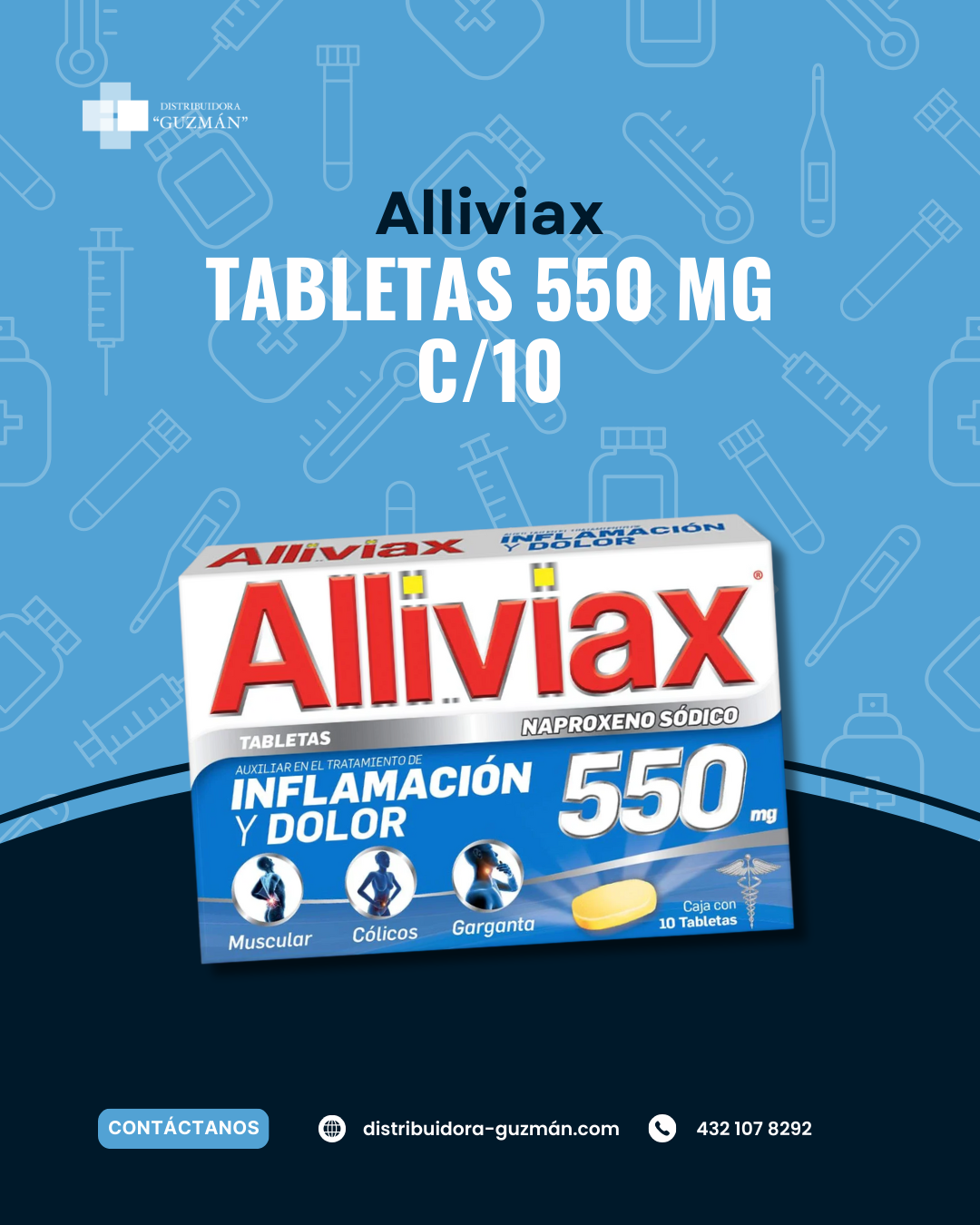 Alliviax 550 C/10 es un antiinflamatorio/analgésico (aine) en presentación farmacéutica para alivio temporal de dolor e inflamación. Disponible con Distribuidora Guzmán en Guanajuato. Evita la automedicación.