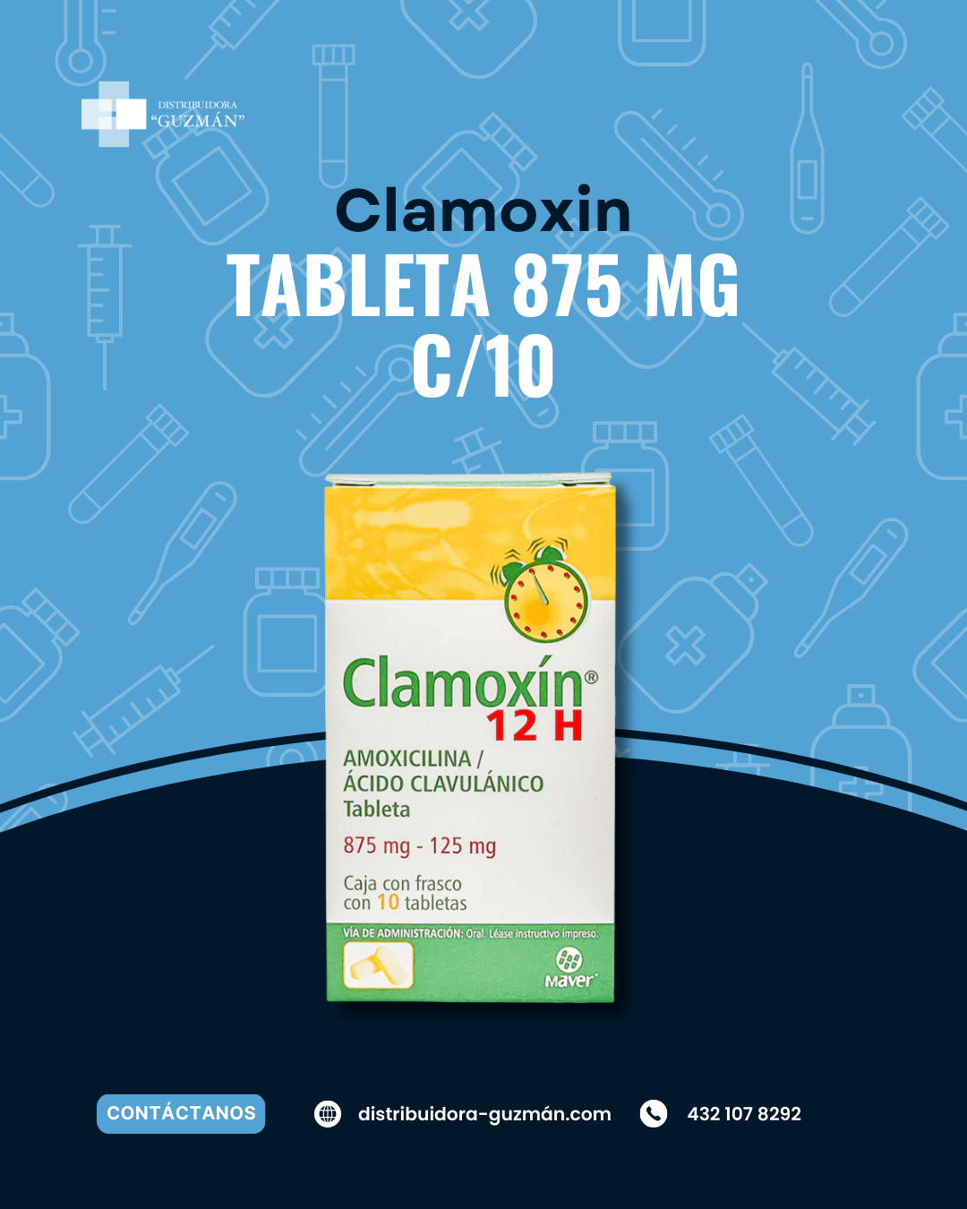 Clamoxin 875 c/10 es un antibiótico de prescripción en presentación farmacéutica para uso bajo indicación médica. Disponible con Distribuidora Guzmán en Guanajuato. Venta y uso bajo indicación médica. Evita la automedicación.