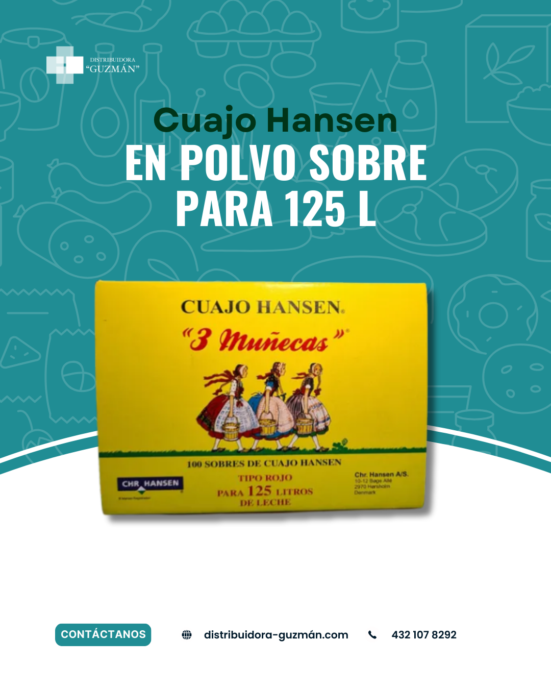 Cuajo Hansen Sobre es un producto de calidad para el hogar. Disponible con Distribuidora Guzmán para surtido de misceláneas, tiendas de abarrotes y autoservicios en Guanajuato.