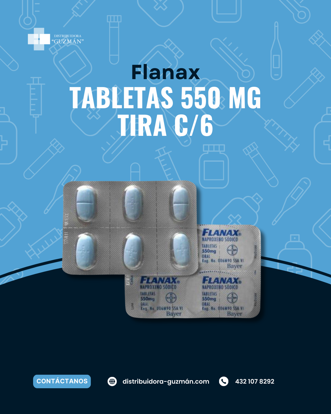 **Flanax 550mg Tira C/6tab** es un **antiinflamatorio/analgésico (aine)** en **tabletas**, utilizado comúnmente para alivio temporal de dolor e inflamación. **Presentación / referencia:** C/6tab; 550mg.