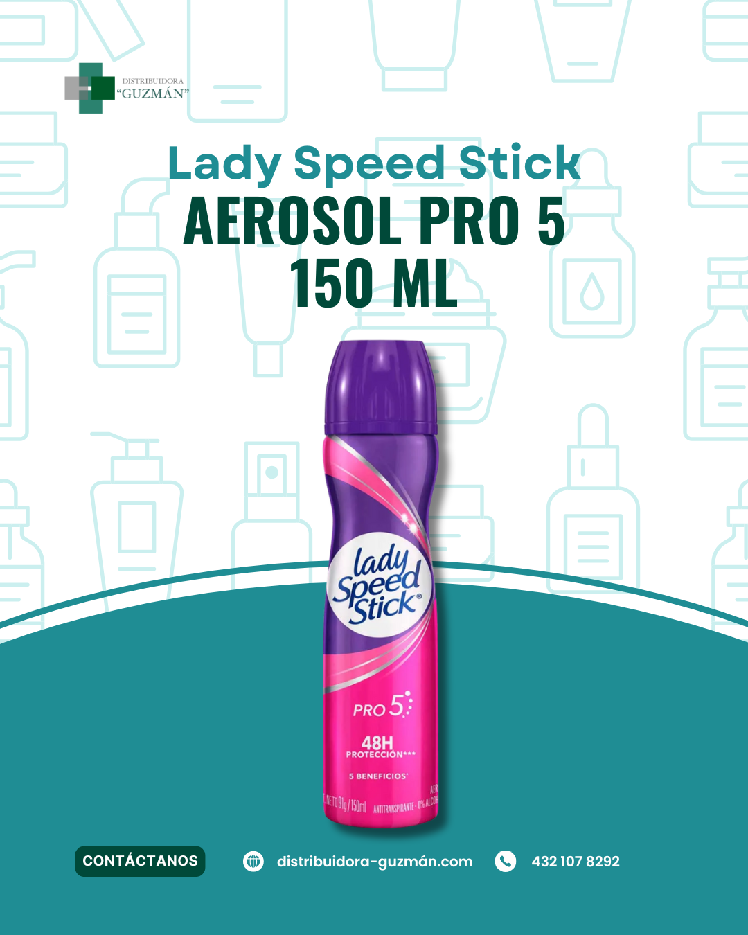 Lady Speed Aerosol Pro5 150ml (150ml): frescura y aroma para el día a día. Surtido en mayoreo con Distribuidora Guzmán en Guanajuato.