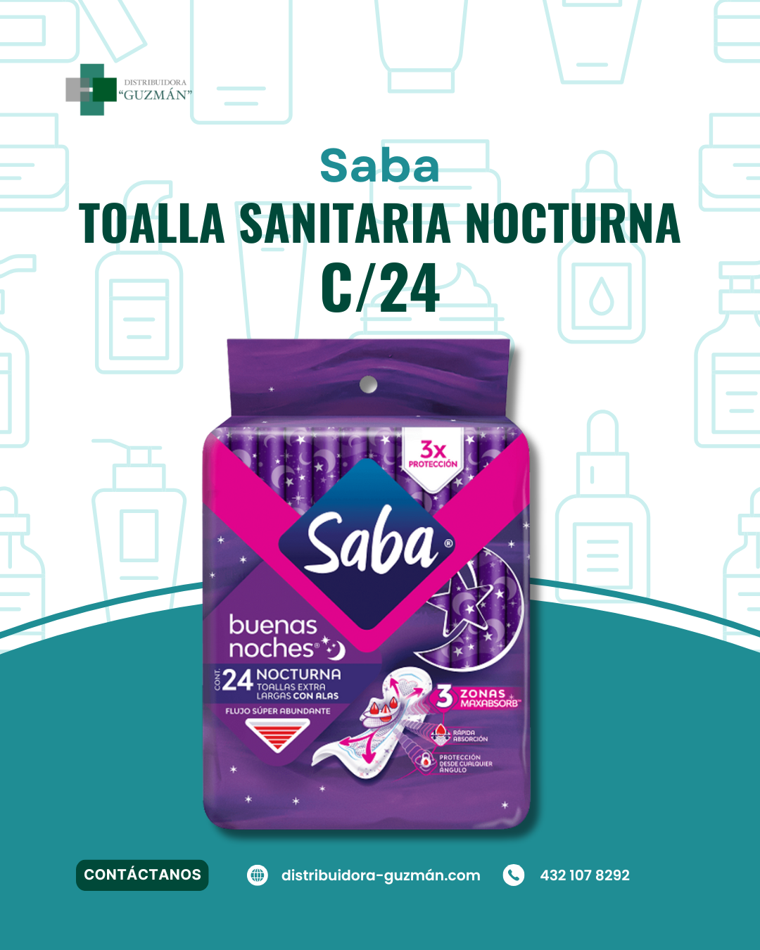 **Saba Buenas Noches C/24** es un producto de **higiene femenina** ideal para rotación de anaquel en **tiendas, farmacias y abarrotes**. En **Distribuidora Guzmán** lo ofrecemos para **mayoreo en Guanajuato**, con enfoque en surtido constante.