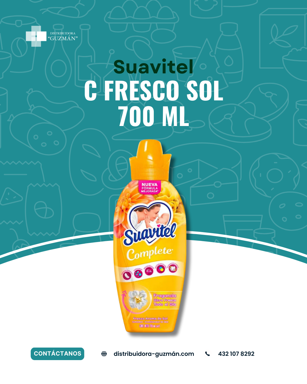 Suavitel C Fresco Sol 700ml es un suavizante de telas utilizado para suavizado y perfumado de ropa. Presentación: 700ml.