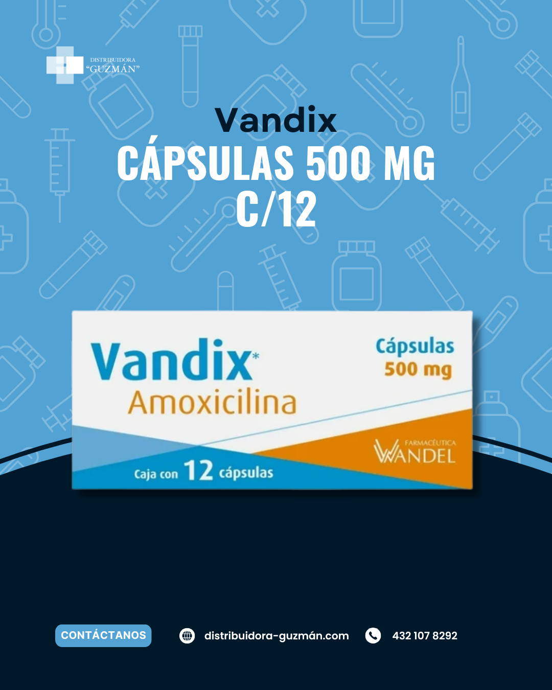 **Vandix 500mg C/12cap** es un **antibiótico de prescripción** en **cápsulas**, utilizado comúnmente para uso bajo indicación médica. **Presentación / referencia:** C/12cap; 500mg.