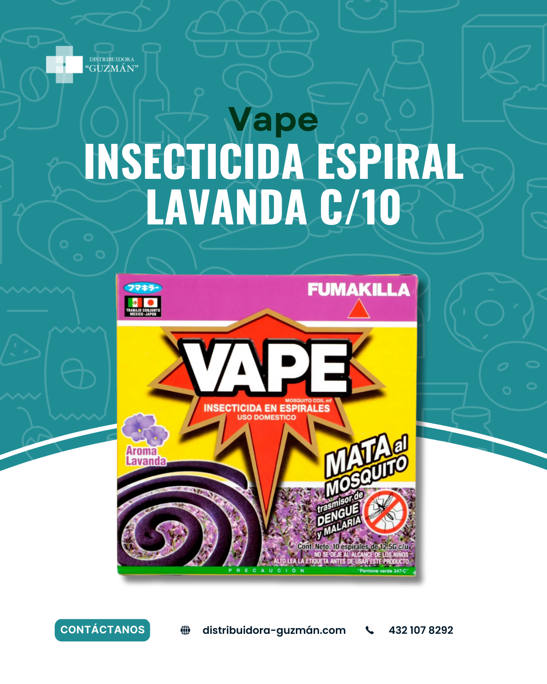 Vape espiral lavanda C/10 es un insecticida utilizado para eliminación y repelente de mosquitos e insectos. Presentación: C/10.